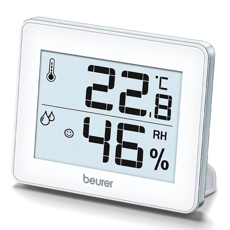 Le Beurer HM 16 affiche température et humidité intérieure avec un grand écran, des icônes smiley pour évaluer visuellement le confort, et des indicateurs maxi/mini. Se pose ou se fixe au mur.